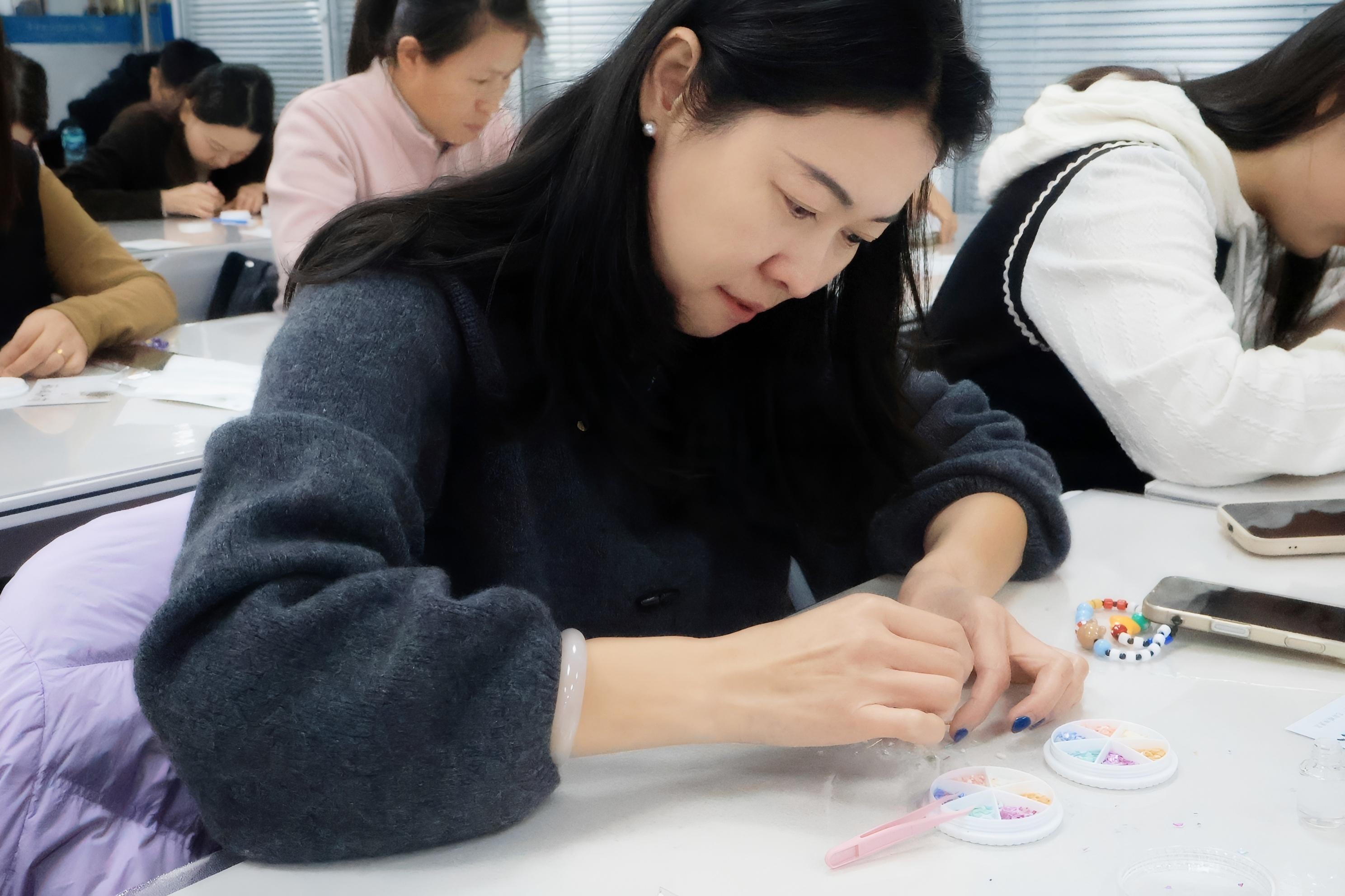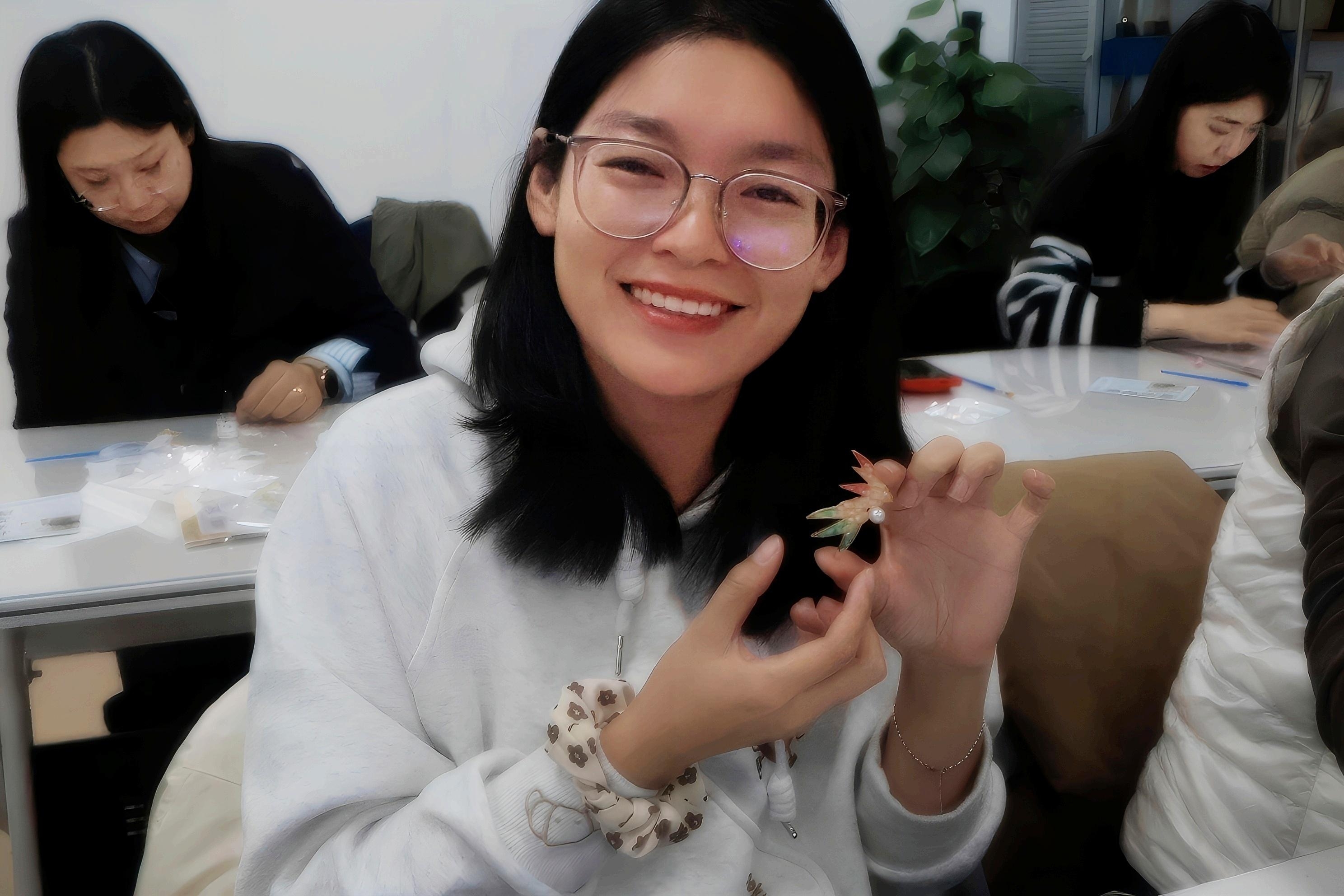 活动现场笑语盈盈,近50名参与者均顺利完成作品,不少老师当场佩戴上自己亲手制作的螺钿胸针,脸上洋溢着满满的成就感。大家纷纷表示,这次体验不仅学会了一项传统手艺,更在慢下来的创作过程中释放了工作压力,深刻体会到“工匠精神”中专注、严谨的内核。来自不同机关部处与公司的教职工们通过活动增进了交流,在共同感受非遗之美的过程中凝聚了情感。