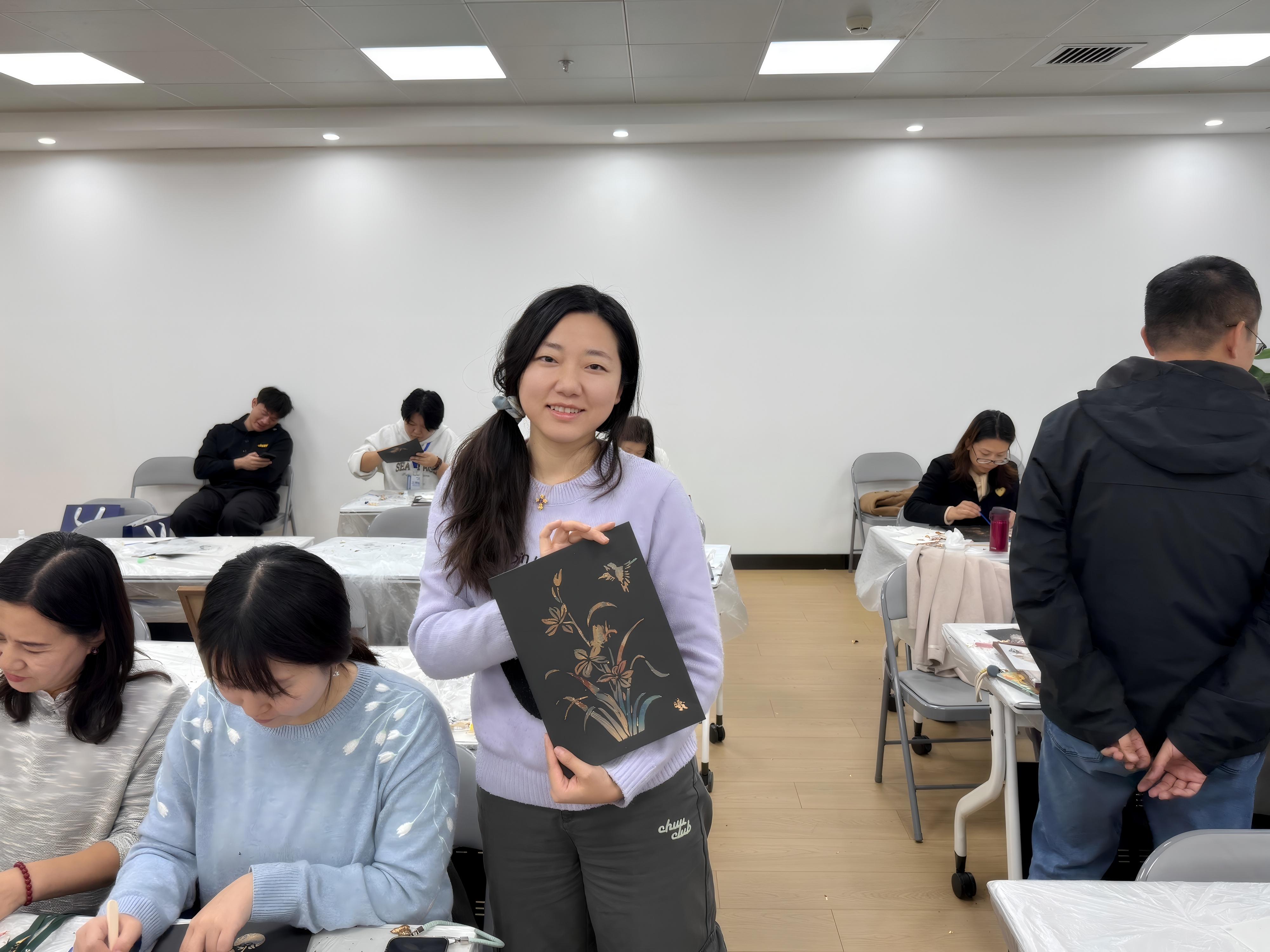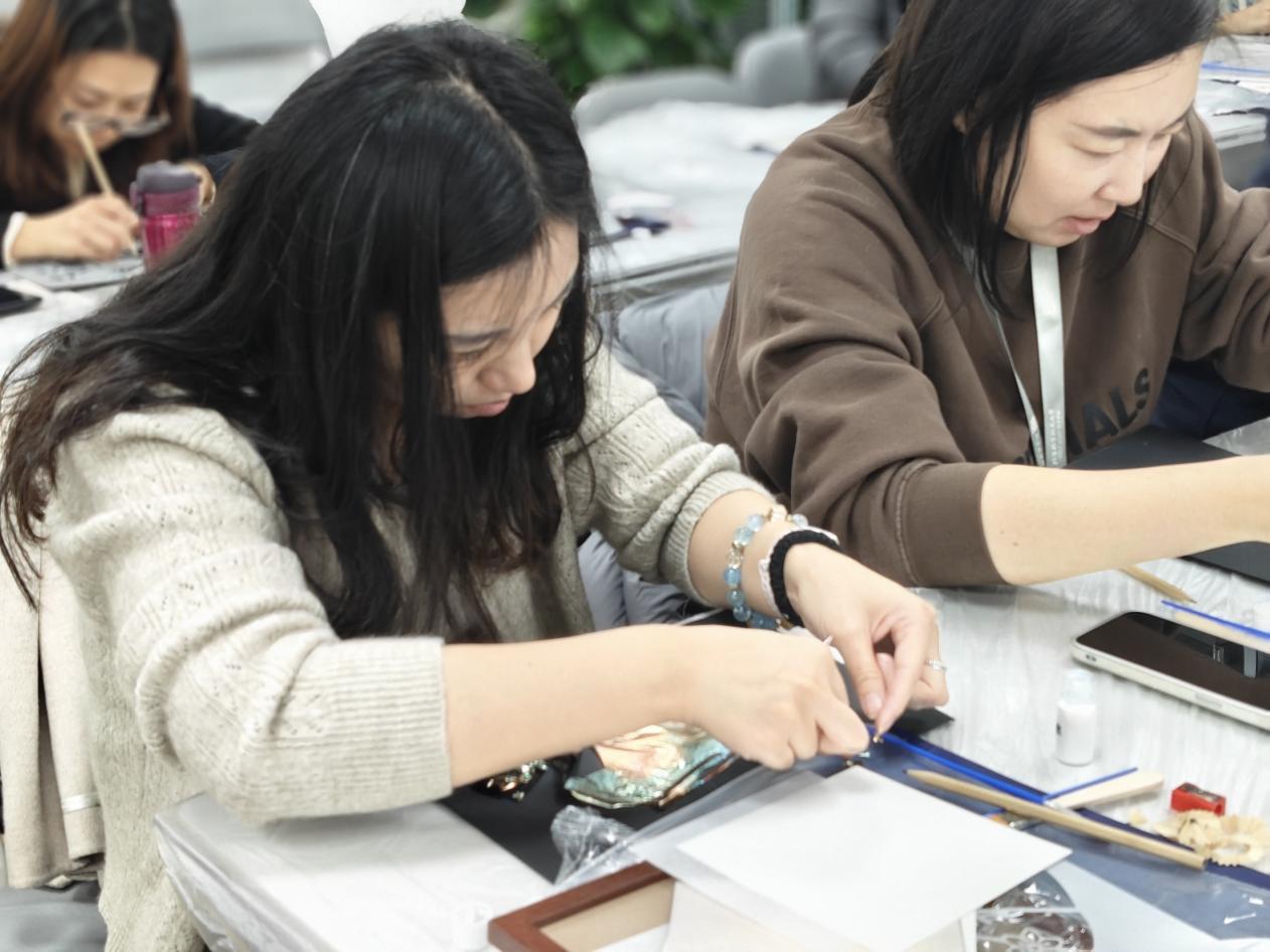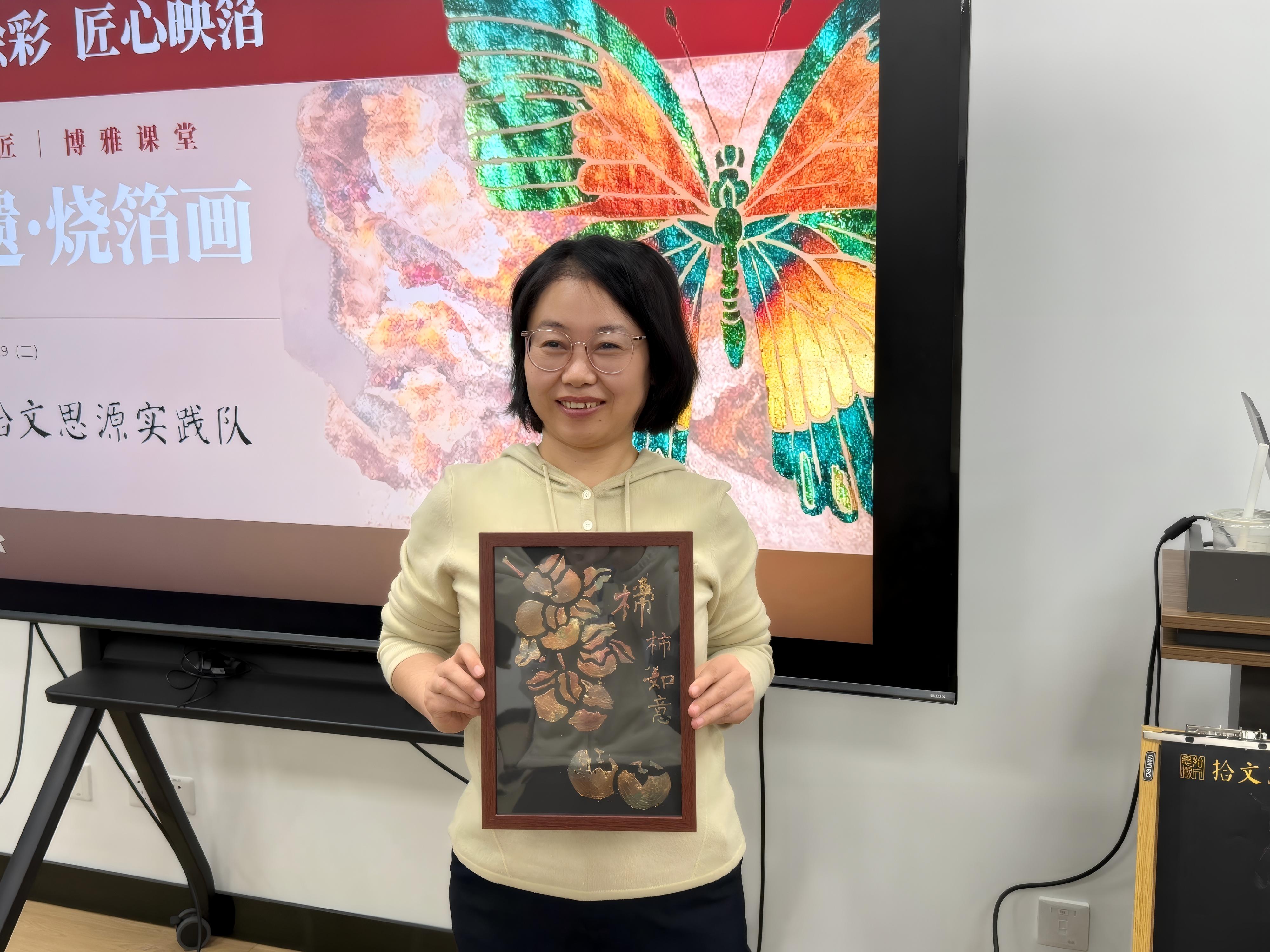 参与活动的老师们纷纷表示,这是一场解压又治愈的艺术体验。有老师分享:“专注于色彩搭配与构图的过程特别放松,能暂时忘却工作压力,感受到创造的纯粹乐趣。”也有老师感慨:“看着不起眼的箔片在手中变成完整的画作,成就感十足,也让我对非遗工艺的魅力有了更直观的认识。”活动尾声,大家纷纷展示自己的作品,互相欣赏点赞,现场洋溢着满满的喜悦与成就感。